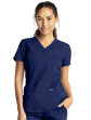 A V-neck top features front and back princess seams, front patch pockets, multi-sectional exterior pocket, utility loop, back yoke and side vents